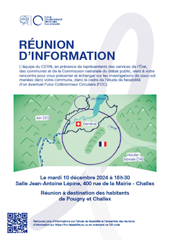 Ces premières réunions d’information concernent exclusivement les études de sous-sol. Le CERN dialogue actuellement avec les deux États hôtes, la France et la Suisse, en lien avec la Commission nationale du débat public (CNDP), afin de définir les modalités d'un processus plus large de réunions d'information générale et de participation du public, qui se mettra pour sa part en place courant 2025.
